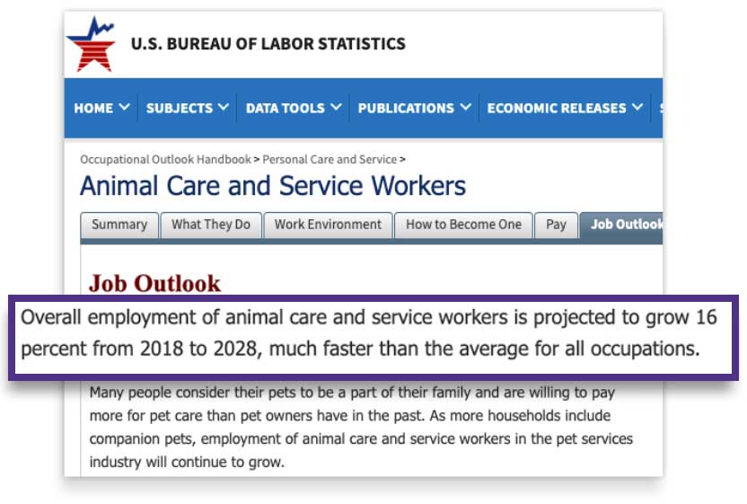 There’s never been a better time to get into dog training. The US Dept. of Labor projects Animal Care will grow much faster than the average occupation from 2022 to 2028. Pet sales are at an all-time high in a $80 billion industry, projected to grow throughout the decade, while most industries are contracting. Rescue and adoption centers are experiencing their highest rates ever, so NOW is the time to join this global boom and get paid to do what you love.