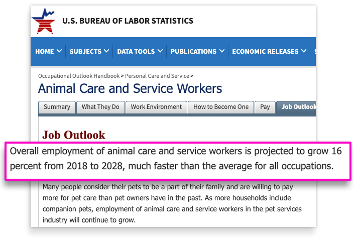 There’s never been a better time to get into dog training. The US Dept. of Labor projects Animal Care will grow much faster than the average occupation from 2022 to 2028. Pet sales are at an all-time high in a $80 billion industry, projected to grow throughout the decade, while most industries are contracting. Rescue and adoption centers are experiencing their highest rates ever, so NOW is the time to join this global boom and get paid to do what you love.